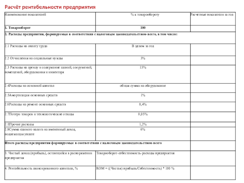 предприятия. В процессе производственно-торговой деятельности годовой товарооборот предприятия составляет ……… тыс. руб. После вычета издержек обращения и уплаты налогов, в распоряжении предприятия остается чистая прибыль в размере ……….тыс. руб. Рентабельность авансированного капитала (стоимость капиталовложений в основные и оборотные средства) составляет …%.