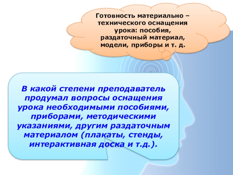 В какой степени преподаватель продумал вопросы оснащения урока необходимыми пособиями, приборами, методическими указаниями, другим раздаточным материалом (плакаты, стенды, интерактивная доска и т.д.).