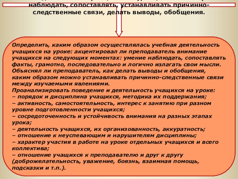 Определить, каким образом осуществлялась учебная деятельность учащихся на уроке: акцентировал ли преподаватель внимание учащихся на следующих моментах: умение наблюдать, сопоставлять факты, грамотно, последовательно и логично излагать свои мысли. Объяснял ли преподаватель, как делать выводы и обобщения, каким образом можно устанавливать причинно-следственные связи между изучаемыми явлениями.
