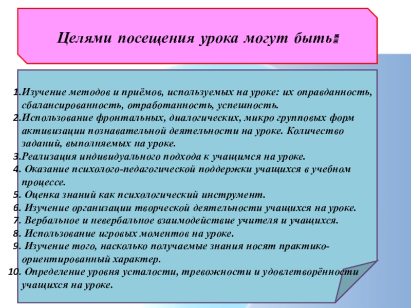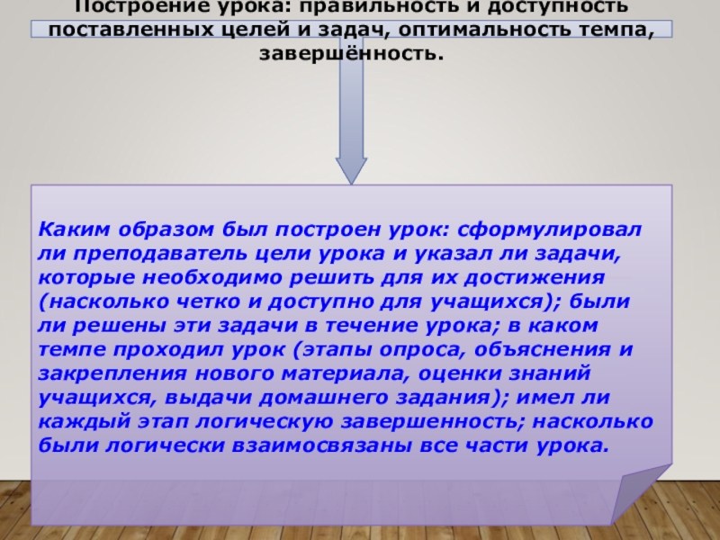 Каким образом был построен урок: сформулировал ли преподаватель цели урока и указал ли задачи, которые необходимо решить для их достижения (насколько четко и доступно для учащихся); были ли решены эти задачи в течение урока; в каком темпе проходил урок (этапы опроса, объяснения и закрепления нового материала, оценки знаний учащихся, выдачи домашнего задания); имел ли каждый этап логическую завершенность; насколько были логически взаимосвязаны все части урока.