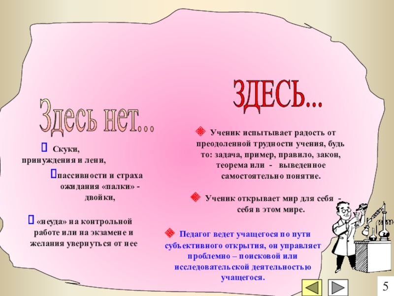 Педагог ведет учащегося по пути субъективного открытия, он управляет проблемно – поисковой или исследовательской деятельностью учащегося.