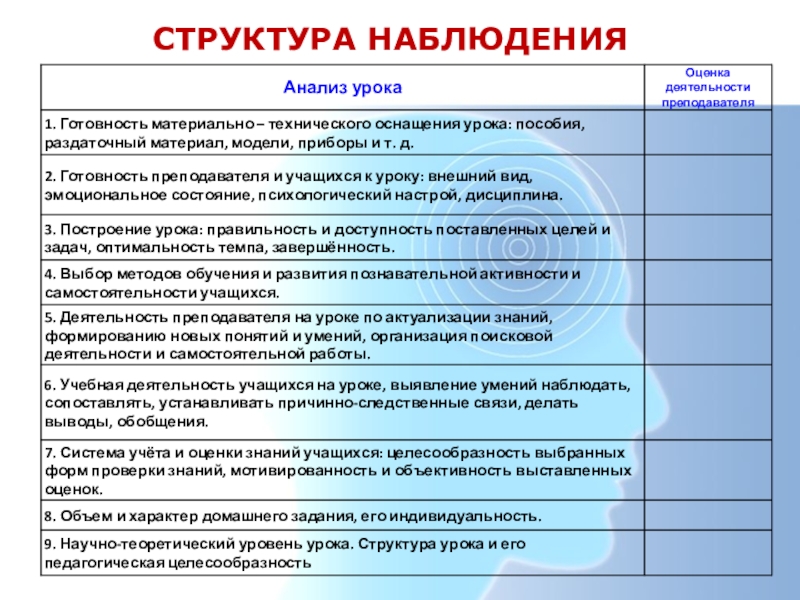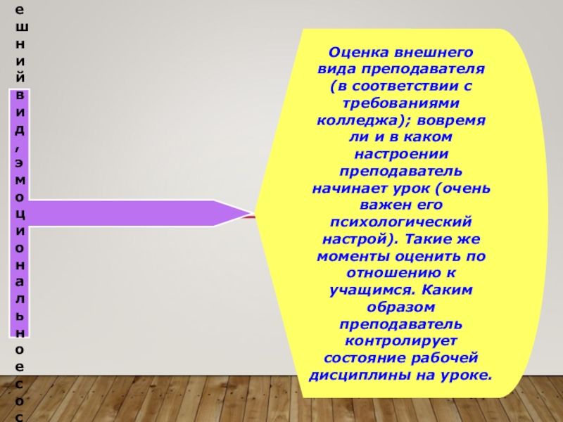Оценка внешнего вида преподавателя (в соответствии с требованиями колледжа); вовремя ли и в каком настроении преподаватель начинает урок (очень важен его психологический настрой). Такие же моменты оценить по отношению к учащимся. Каким образом преподаватель контролирует состояние рабочей дисциплины на уроке.