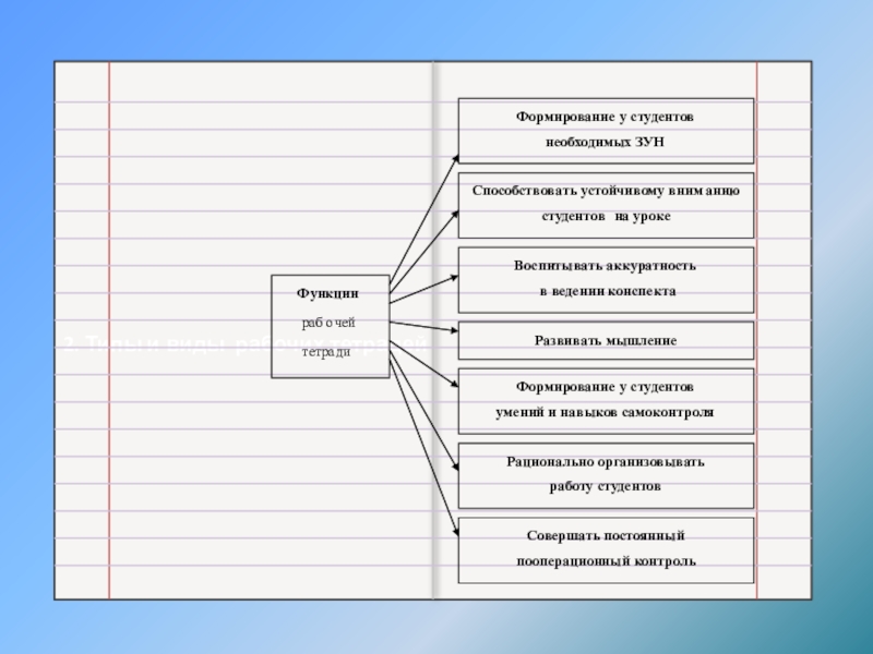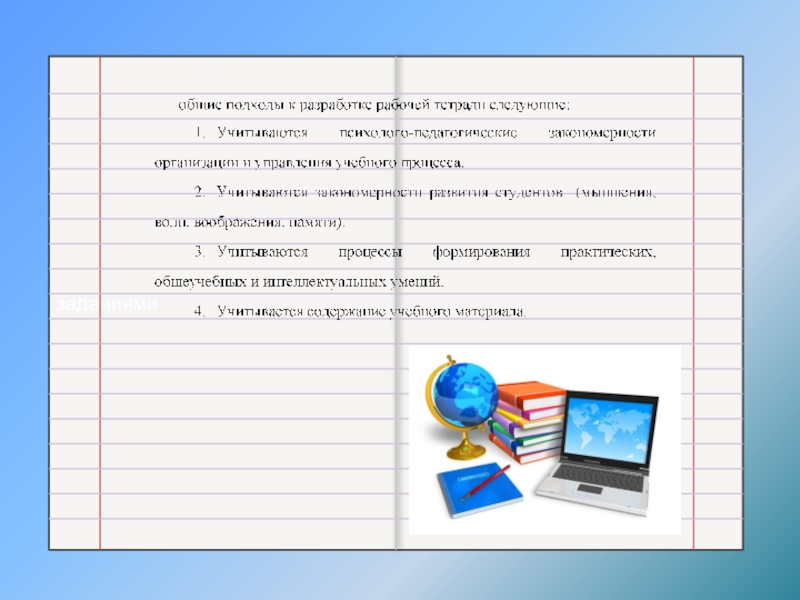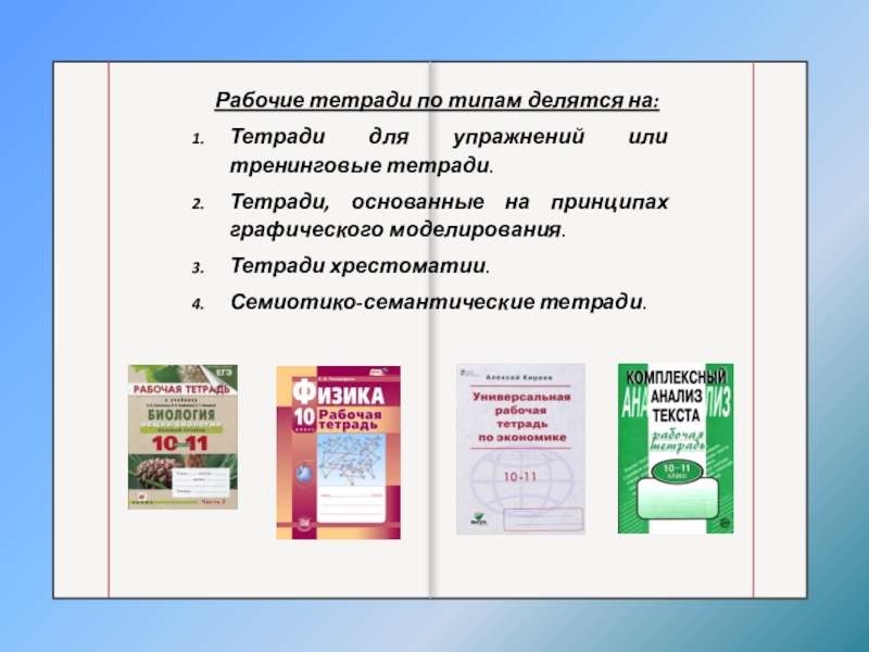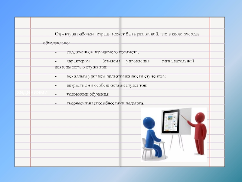 Композиционное построение рабочей тетради зависит от замысла автора, от характера и содержания учебного материала, его объёма, характера вопросов и заданий.