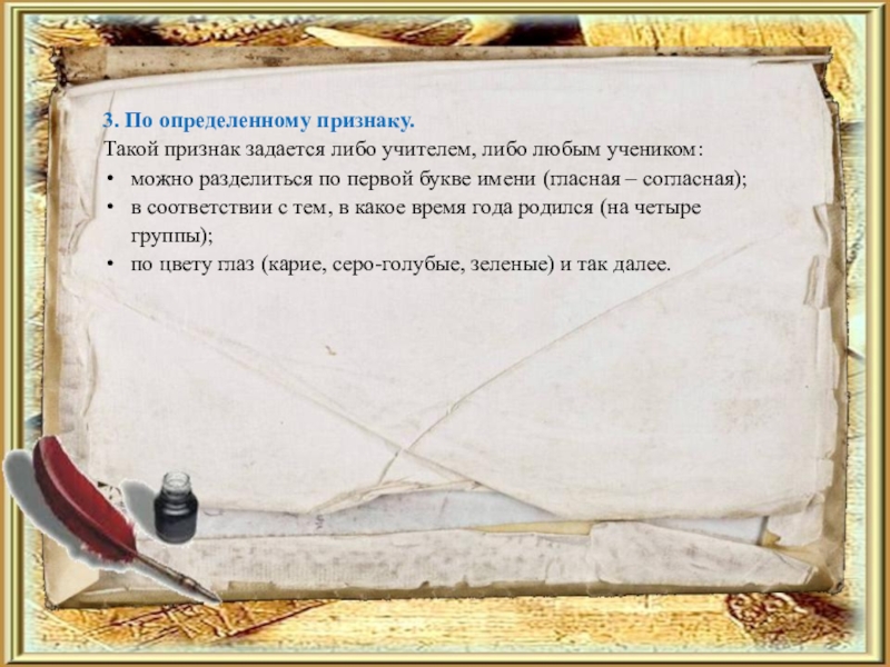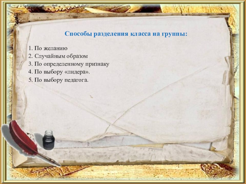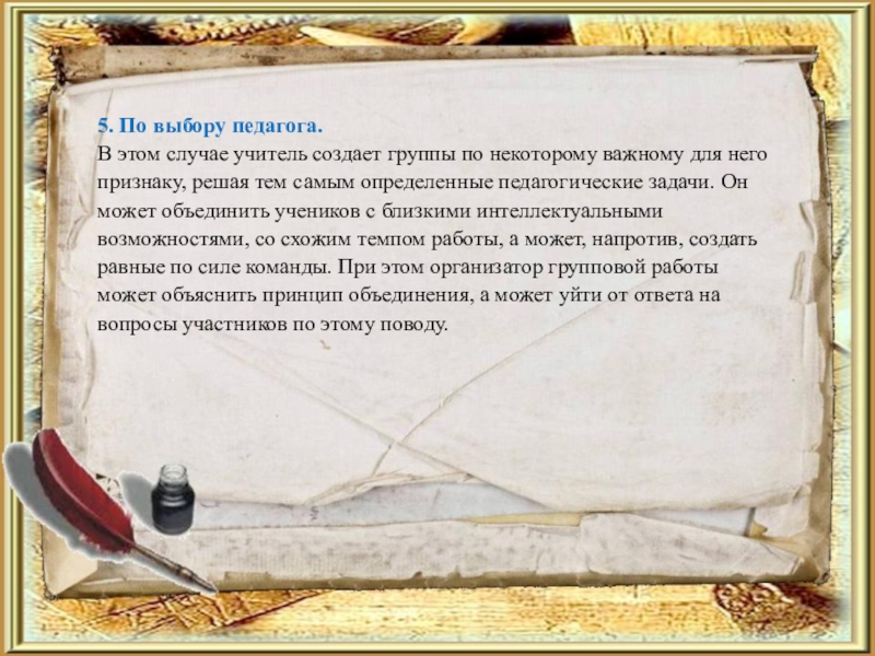 важному для него признаку, решая тем самым определенные педагогические задачи. Он может объединить учеников с близкими интеллектуальными возможностями, со схожим темпом работы, а может, напротив, создать равные по силе команды. При этом организатор групповой работы может объяснить принцип объединения, а может уйти от ответа на вопросы участников по этому поводу.