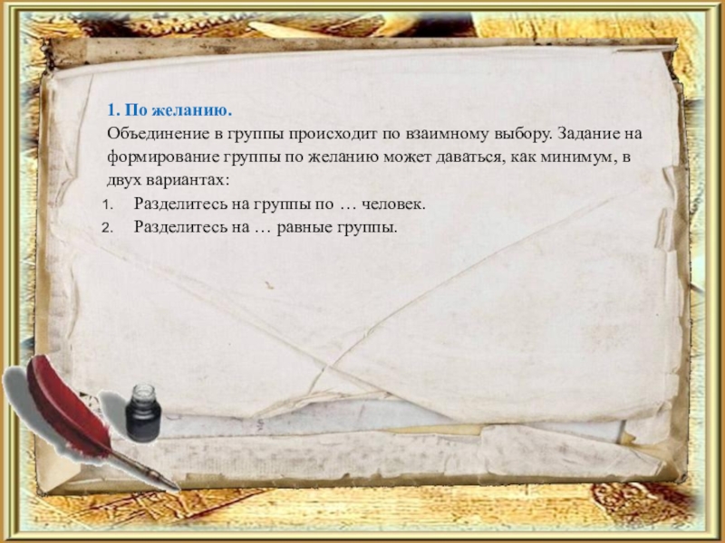 с помощью импровизированных «фантов» (один из учеников с закрытыми глазами называет номер группы, куда отправится ученик, на которого указывает в данный момент педагог) и т.п.
