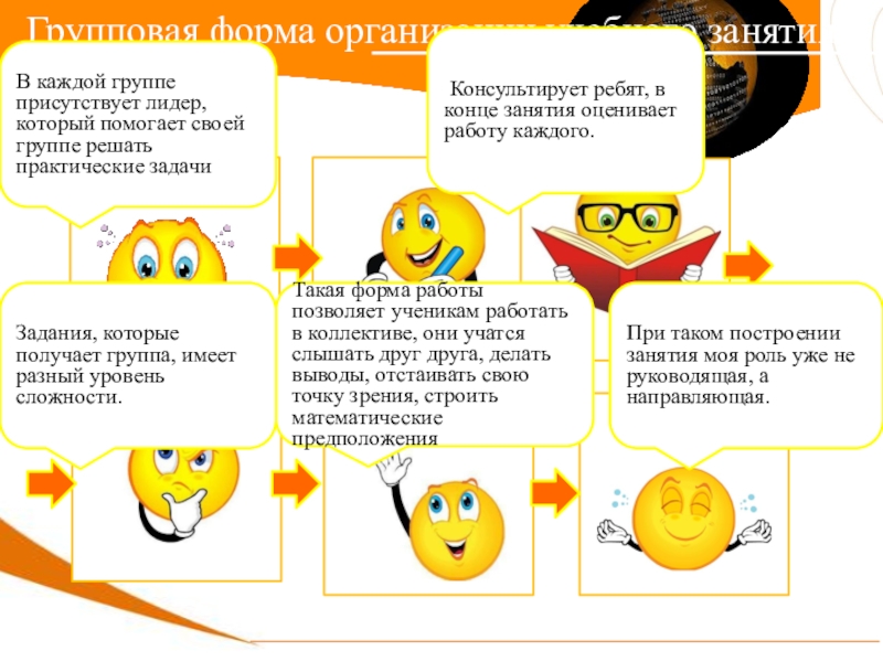Такая форма работы позволяет ученикам работать в коллективе, они учатся слышать друг друга, делать выводы, отстаивать свою точку зрения, строить математические предположения