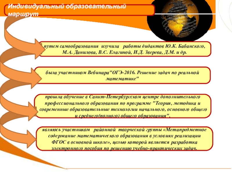 являюсь участником районной творческой группы «Метапредметное содержание математического образования в условиях реализации ФГОС в основной школе», целью которой является разработка электронного пособия по решению учебно-практических задач.