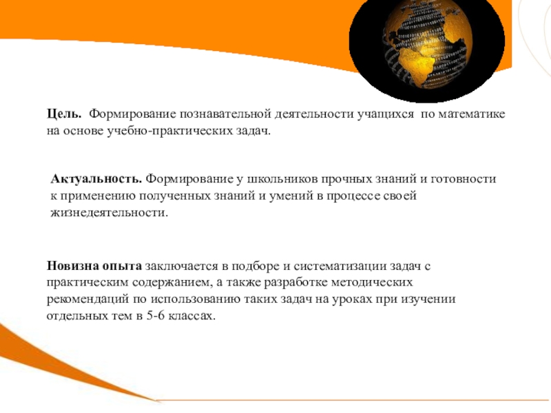 Новизна опыта заключается в подборе и систематизации задач с практическим содержанием, а также разработке методических рекомендаций по использованию таких задач на уроках при изучении отдельных тем в 5-6 классах.