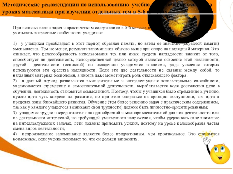 2) в данный период развиваются вычислительные и интеллектуально-познавательные способности, увеличивается стремление к самостоятельной деятельности, вырабатывается воля достижения цели в обучении, деятельность становится осмысленной. Поэтому, чтобы у учащихся было стремление к учению, нужно идти чуть впереди их развития, но при этом опираться на принцип доступности, т.е. идти в пределах зоны ближайшего развития. Обучение (тем более решению задач с практическим содержанием, так как у каждого учащегося возникают свои трудности) должно быть личностно-ориентированным;