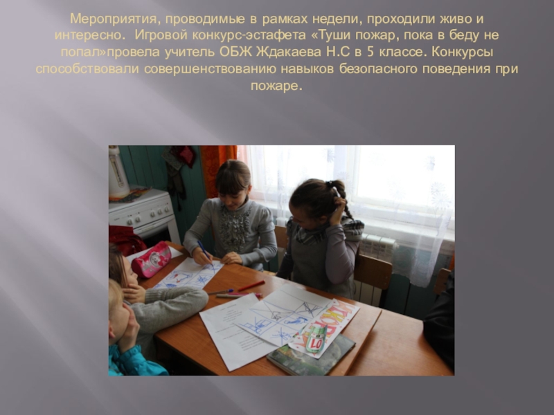 «Туши пожар, пока в беду не попал»провела учитель ОБЖ Ждакаева Н.С в 5 классе. Конкурсы способствовали совершенствованию навыков безопасного поведения при пожаре.