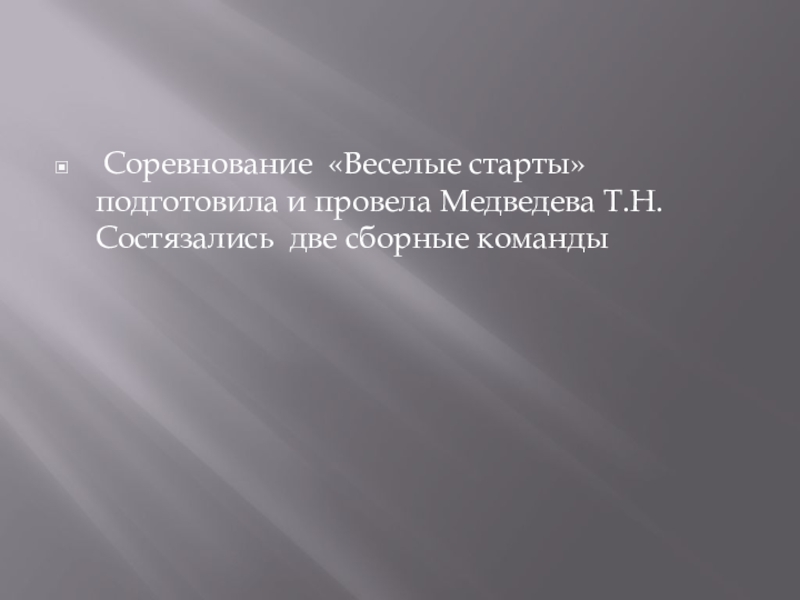Слайд 16 Соревнование «Веселые старты» подготовила и провела Медведева Т.Н. Состязались две