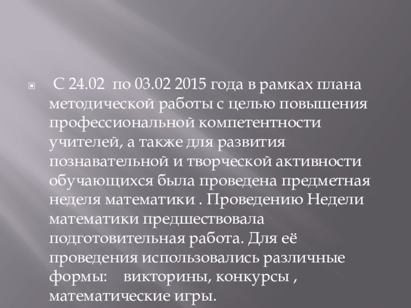 с целью повышения профессиональной компетентности учителей, а также для развития познавательной и творческой активности обучающихся была проведена предметная неделя математики . Проведению Недели математики предшествовала подготовительная работа. Для её проведения использовались различные формы: викторины, конкурсы , математические игры.