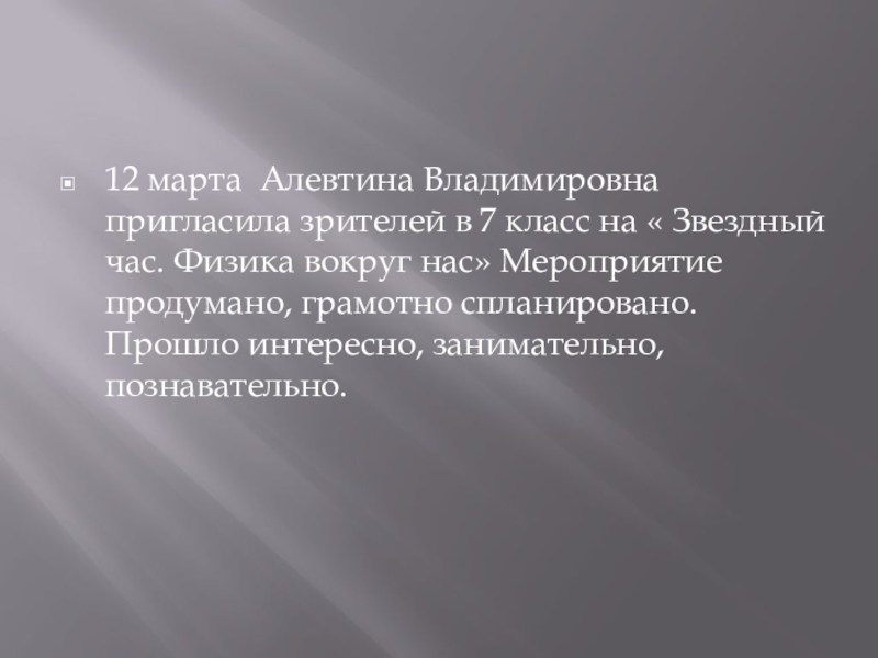 Слайд 3912 марта Алевтина Владимировна пригласила зрителей в 7 класс на «