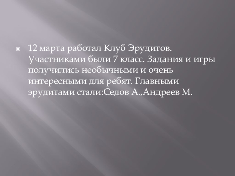 Слайд 4612 марта работал Клуб Эрудитов. Участниками были 7 класс. Задания и