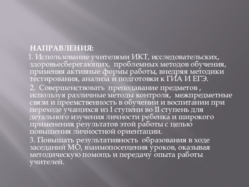 здоровьесберегающих, проблемных методов обучения, применяя активные формы работы, внедряя методики тестирования, анализа и подготовки к ГИА И ЕГЭ.