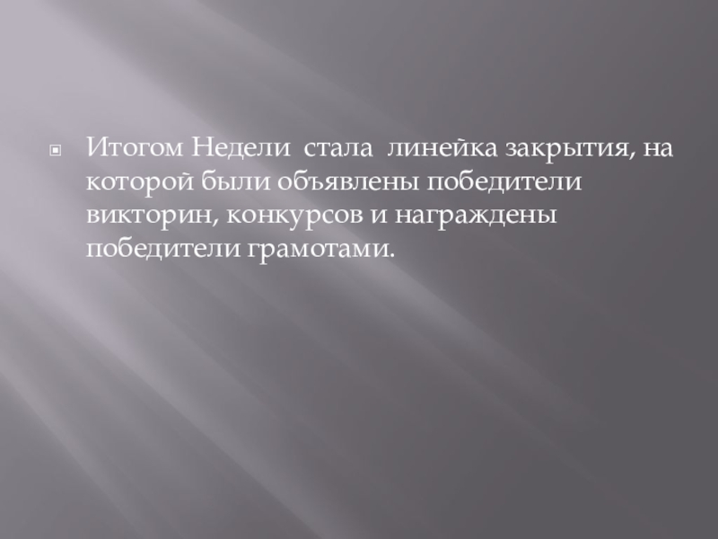 Слайд 50Итогом Недели стала линейка закрытия, на которой были объявлены победители викторин,