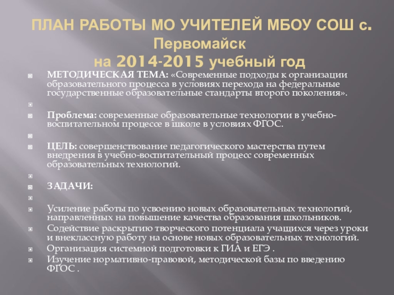 Слайд 2ПЛАН РАБОТЫ МО УЧИТЕЛЕЙ МБОУ СОШ с.Первомайск