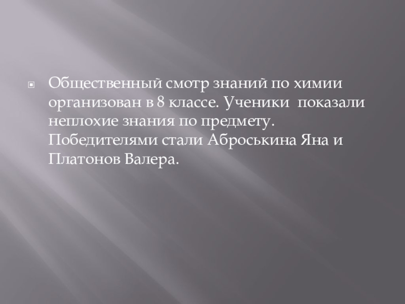 Слайд 43Общественный смотр знаний по химии организован в 8 классе. Ученики показали