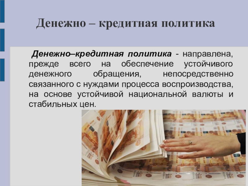 Денежно – кредитная политикаДенежно–кредитная политика - направлена, прежде всего на обеспечение устойчивого денежного обращения, непосредственно связанного