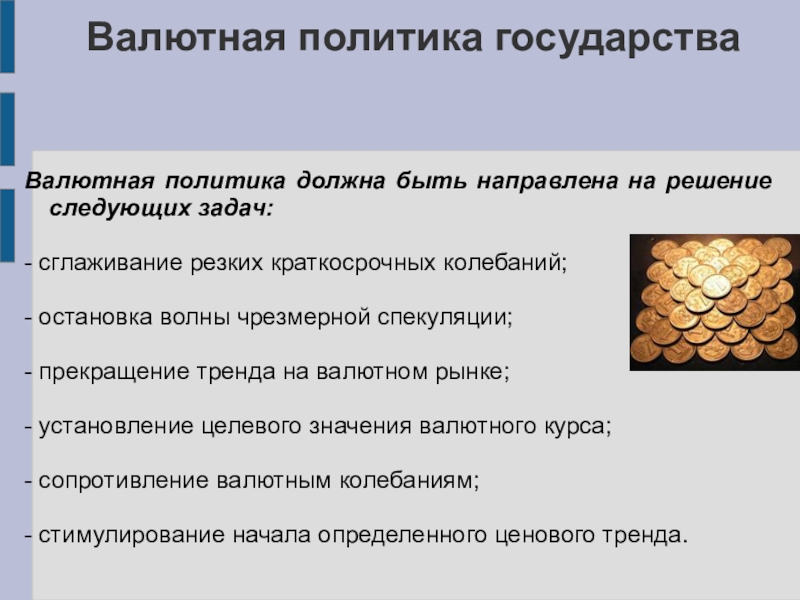 Валютная политика государстваВалютная политика должна быть направлена на решение следующих задач:- сглаживание резких краткосрочных колебаний;- остановка волны