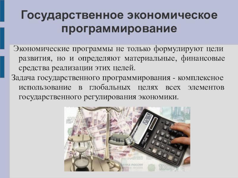 Государственное экономическое программирование Экономические программы не только формулируют цели развития, но и определяют материальные, финансовые средства реализации