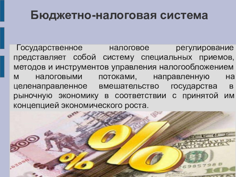 Бюджетно-налоговая системаГосударственное налоговое регулирование представляет собой систему специальных приемов, методов и инструментов управления налогообложением м налоговыми
