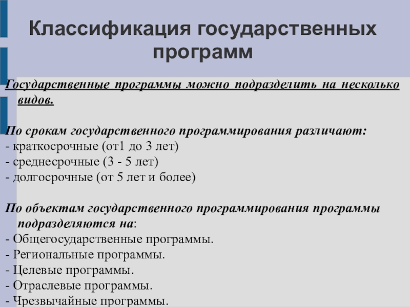 Классификация государственных программ Государственные программы можно подразделить на несколько видов.По срокам государственного программирования различают:- краткосрочные (от1 до
