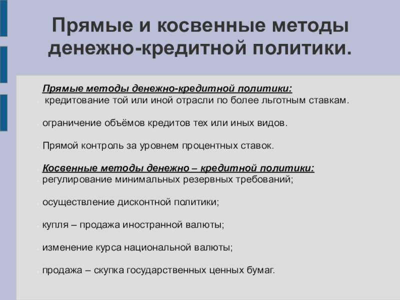 Слайд 11Прямые и косвенные методы денежно-кредитной политики.