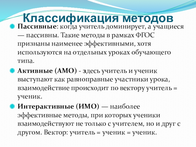 Классификация методов Пассивные: когда учитель доминирует, а учащиеся — пассивны. Такие методы в рамках ФГОС признаны наименее