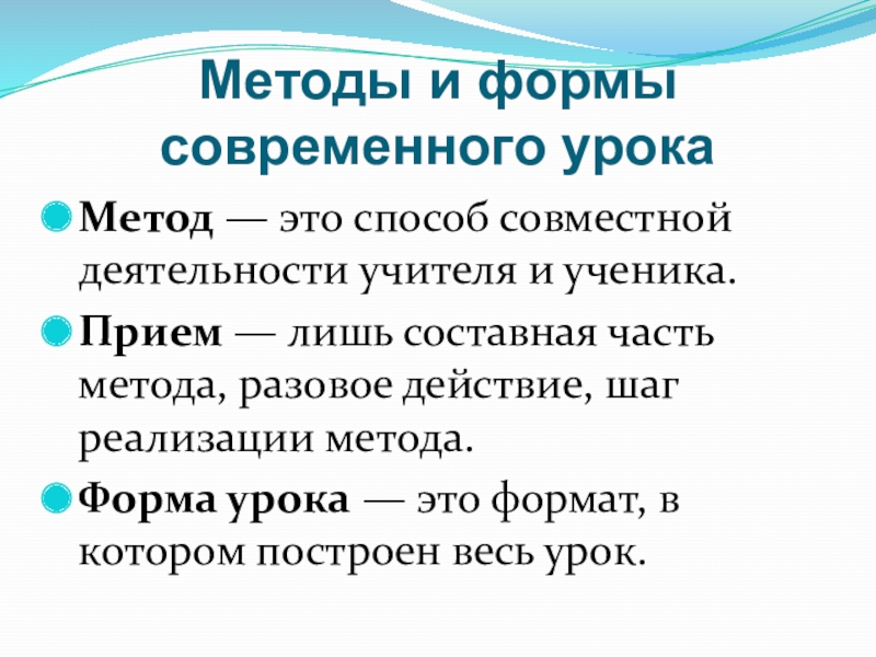 Методы и формы современного урока Метод — это способ совместной деятельности учителя и ученика. Прием — лишь составная часть метода, разовое действие, шаг реализации метода. Форма урока — это формат, в котором построен весь урок.