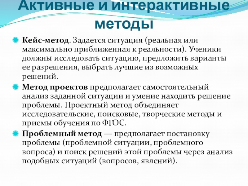 Активные и интерактивные методыКейс-метод. Задается ситуация (реальная или максимально приближенная к реальности). Ученики должны исследовать ситуацию, предложить