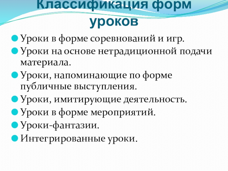 Классификация форм уроков Уроки в форме соревнований и игр.Уроки на основе нетрадиционной подачи материала.Уроки, напоминающие по форме
