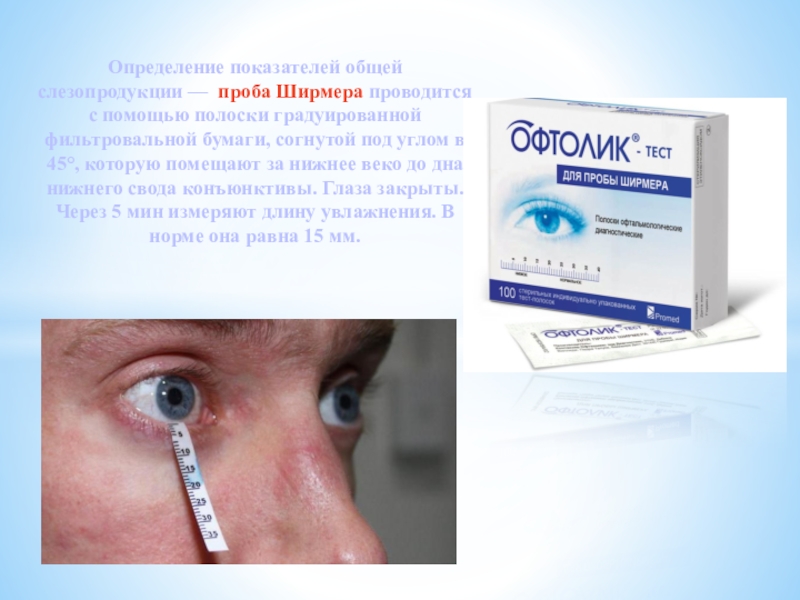 полоски градуированной фильтровальной бумаги, согнутой под углом в 45°, которую помещают за нижнее веко до дна нижнего свода конъюнктивы. Глаза закрыты. Через 5 мин измеряют длину увлажнения. В норме она равна 15 мм.
