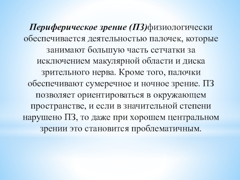 Слайд 10Периферическое зрение (ПЗ)физиологически обеспечивается деятельностью палочек, которые занимают большую часть сетчатки