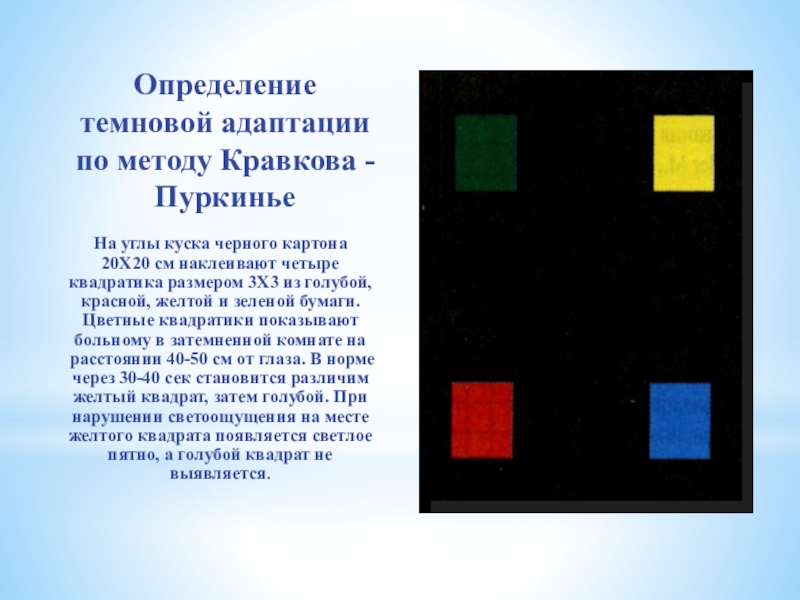 картона 20Х20 см наклеивают четыре квадратика размером 3Х3 из голубой, красной, желтой и зеленой бумаги. Цветные квадратики показывают больному в затемненной комнате на расстоянии 40-50 см от глаза. В норме через 30-40 сек становится различим желтый квадрат, затем голубой. При нарушении светоощущения на месте желтого квадрата появляется светлое пятно, а голубой квадрат не выявляется.