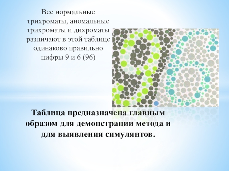 Слайд 14Все нормальные трихроматы, аномальные трихроматы и дихроматы различают в этой таблице