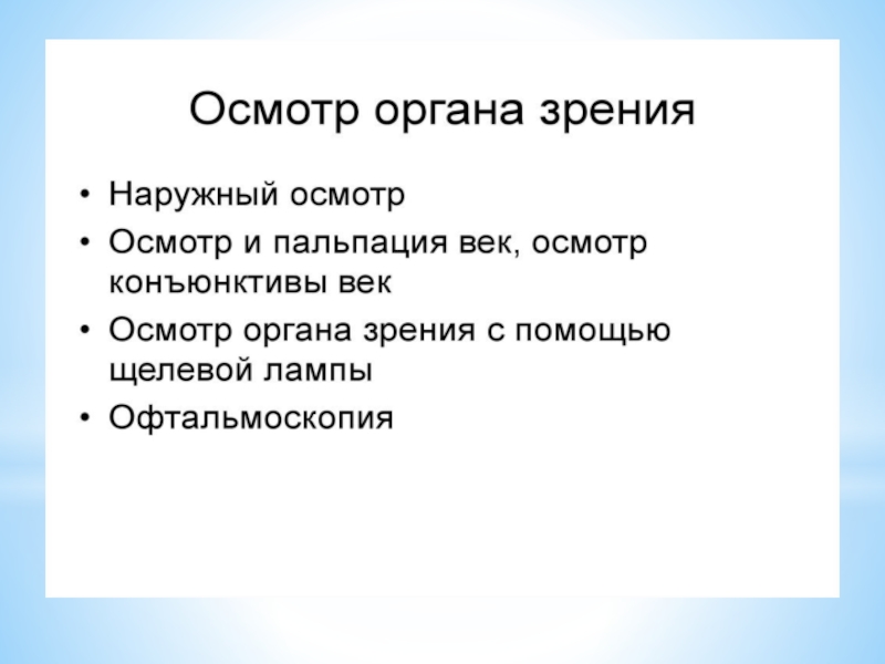 обследования органов зрения. Внешний (общий) осмотр. Изучение жалоб и анамнез. Наружный осмотр глаза и его придатков. Осмотр глазного яблока. Организацию сестринского процесса при подготовке пациентов к обследованиям.