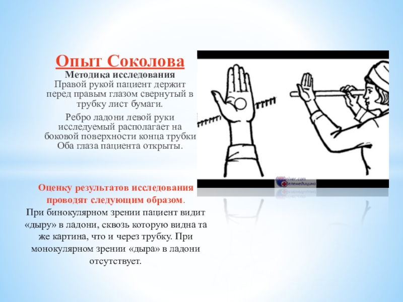 При бинокулярном зрении пациент видит «дыру» в ладони, сквозь которую видна та же картина, что и через трубку. При монокулярном зрении «дыра» в ладони отсутствует.