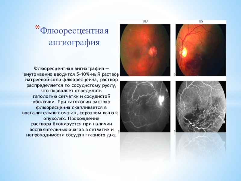 Флюоресцентная ангиография — внутривенно вводится 5-10%-ный раствор натриевой соли флюоресцеина,