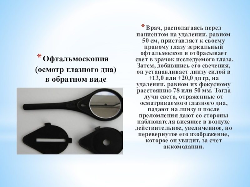 равном 50 см, приставляет к своему правому глазу зеркальный офтальмоскоп и отбрасывает свет в зрачок исследуемого глаза. Затем, добившись его свечения, он устанавливает линзу силой в +13,0 или +20,0 дптр, на удалении, равном их фокусному расстоянию 78 или 50 мм. Тогда лучи света, отраженные от осматриваемого глазного дна, падают на линзу и после преломления дают со стороны наблюдателя висящее в воздухе действительное, увеличенное, но перевернутое его изображение, которое он увидит, за счет аккомодации.