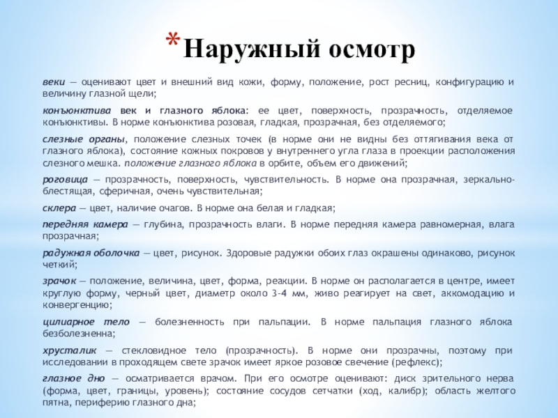 конъюнктива век и глазного яблока: ее цвет, поверхность, прозрачность, отделяемое конъюнктивы. В норме конъюнктива розовая, гладкая, прозрачная, без отделяемого;