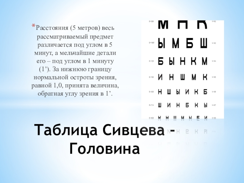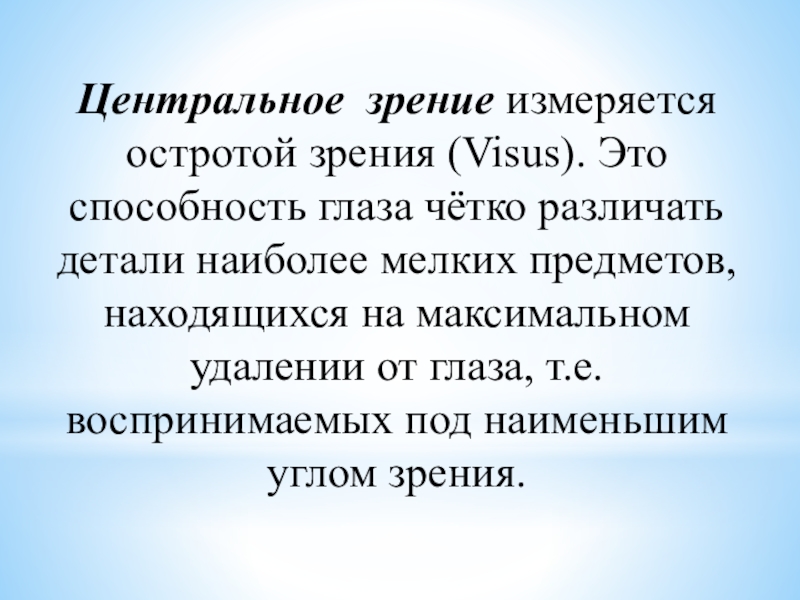 Слайд 5Центральное зрение измеряется остротой зрения (Visus). Это способность глаза чётко различать