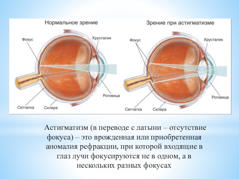 Слайд 8Астигматизм (в переводе с латыни – отсутствие фокуса) – это врожденная
