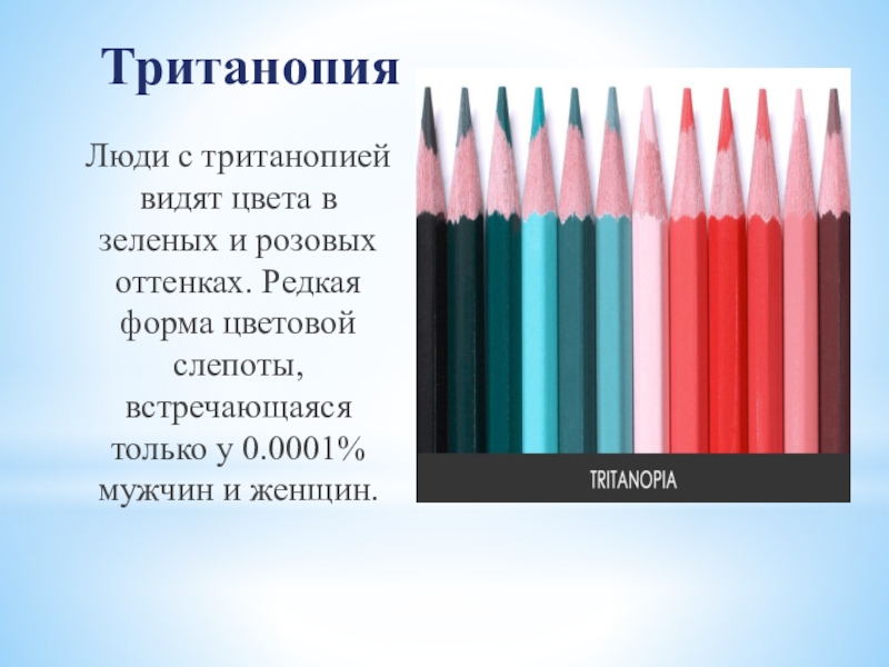 Люди с тританопией видят цвета в зеленых и розовых оттенках.