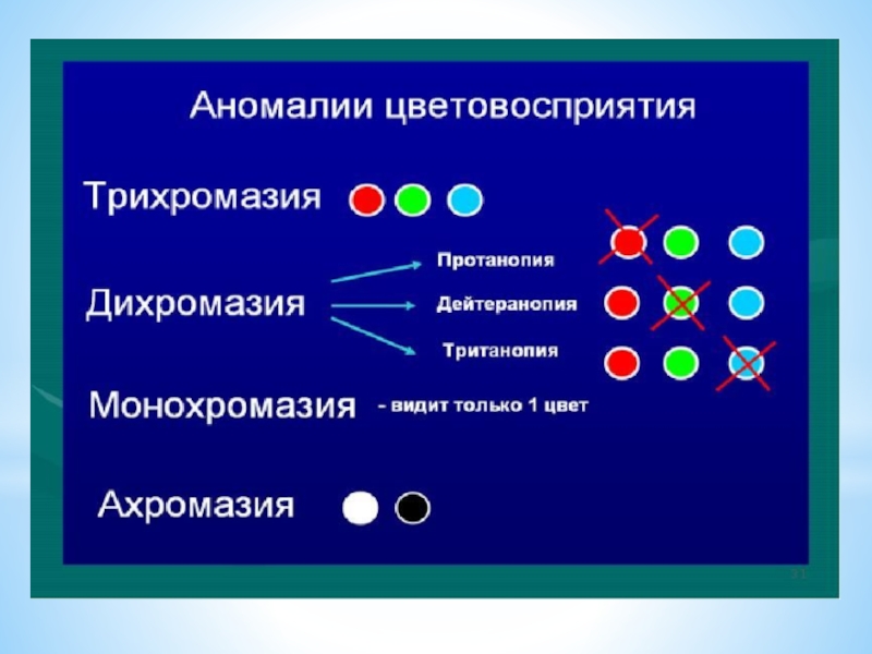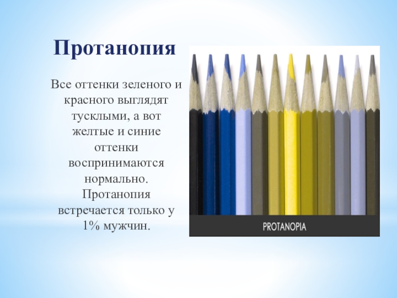 и синие оттенки воспринимаются нормально. Протанопия встречается только у 1% мужчин.