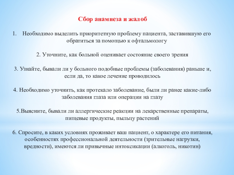 6. Спросите, в каких условиях проживает ваш пациент, о характере его питания, особенностях профессиональной деятельности (зрительные нагрузки, вредности), имеются ли привычные интоксикации (алкоголь, никотин)