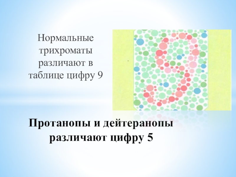 Слайд 15Нормальные трихроматы различают в таблице цифру 9
