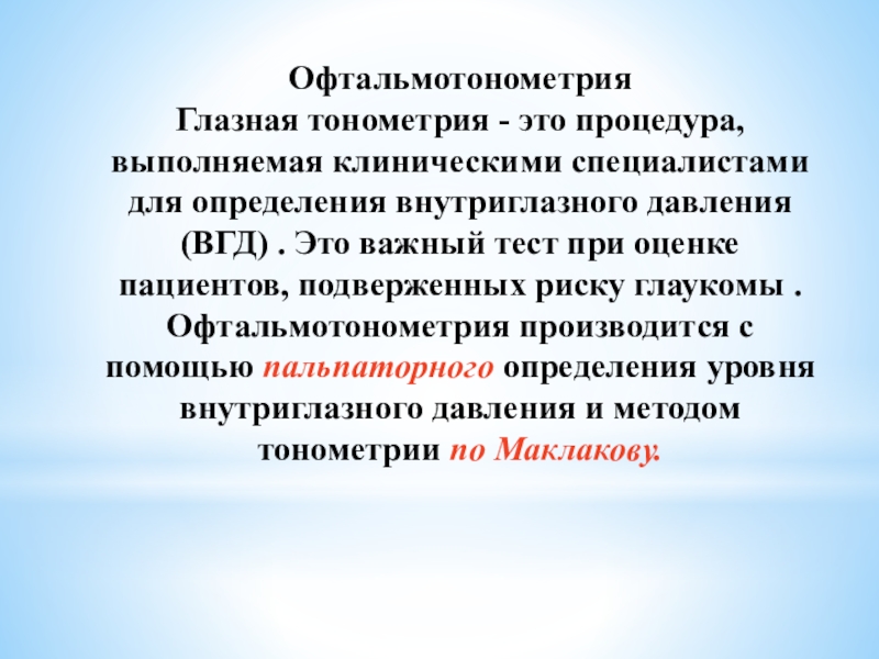 давления (ВГД) . Это важный тест при оценке пациентов, подверженных риску глаукомы .