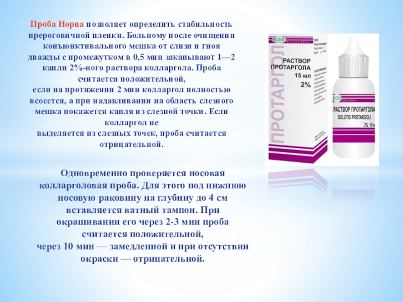 Слайд 38Проба Норна позволяет определить стабильность прероговичной пленки. Больному после очищения конъюнктивального