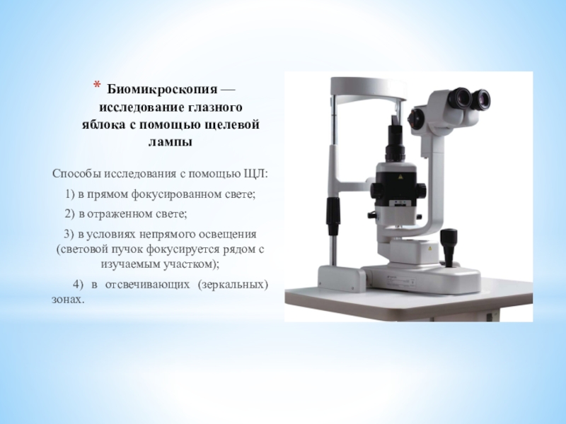 3) в условиях непрямого освещения (световой пучок фокусируется рядом с изучаемым участком);
